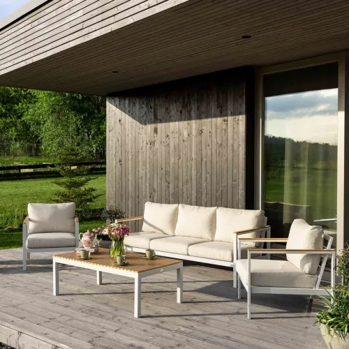 Садові меблі Tivoli були створені з урахуванням комфорту використання, функціональності та елегантності. Набір, що включає тримісний диван, два крісла та журнальний столик, ідеально підійде для облаштування вашого саду або тераси, створить місце для відпочинку та проведення часу з близькими. Конструкція меблів поєднує легкий алюмінієвий каркас з елементами з сучасного полівуд матеріалу, що імітує дерево. Такі матеріали гарантують довговічність, стійкість до погодних умов і стильний зовнішній вигляд меблів. Комплект доповнений м'якими подушками графітового кольору. Завдяки універсальному та позачасовому дизайну меблі Tivoli чудово виглядають як у традиційно, так і в сучасно оформлених приміщеннях.